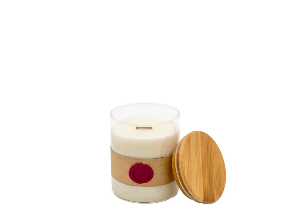 Složení svíčky: sójový vosk, dřevěný knot, vonný esenciální olej